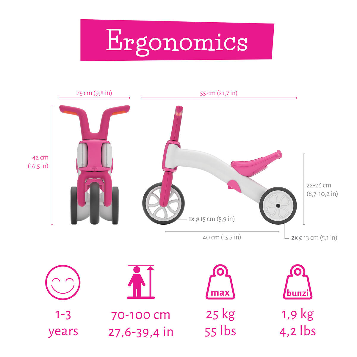 Le Bunzi de Chillafish est une draisienne évolutive 2 en 1 au design unique, conçu pour apprendre à votre enfant à développer son sens de l'équilibre progressivement, de manière ludique et à son propre rythme. Facile d'utilisation, le cadre innovant du porteur peut se transformer du mode 3 roues (Tricycle) en mode 2 roues (draisienne) en quelques secondes et sans utiliser d'outils.