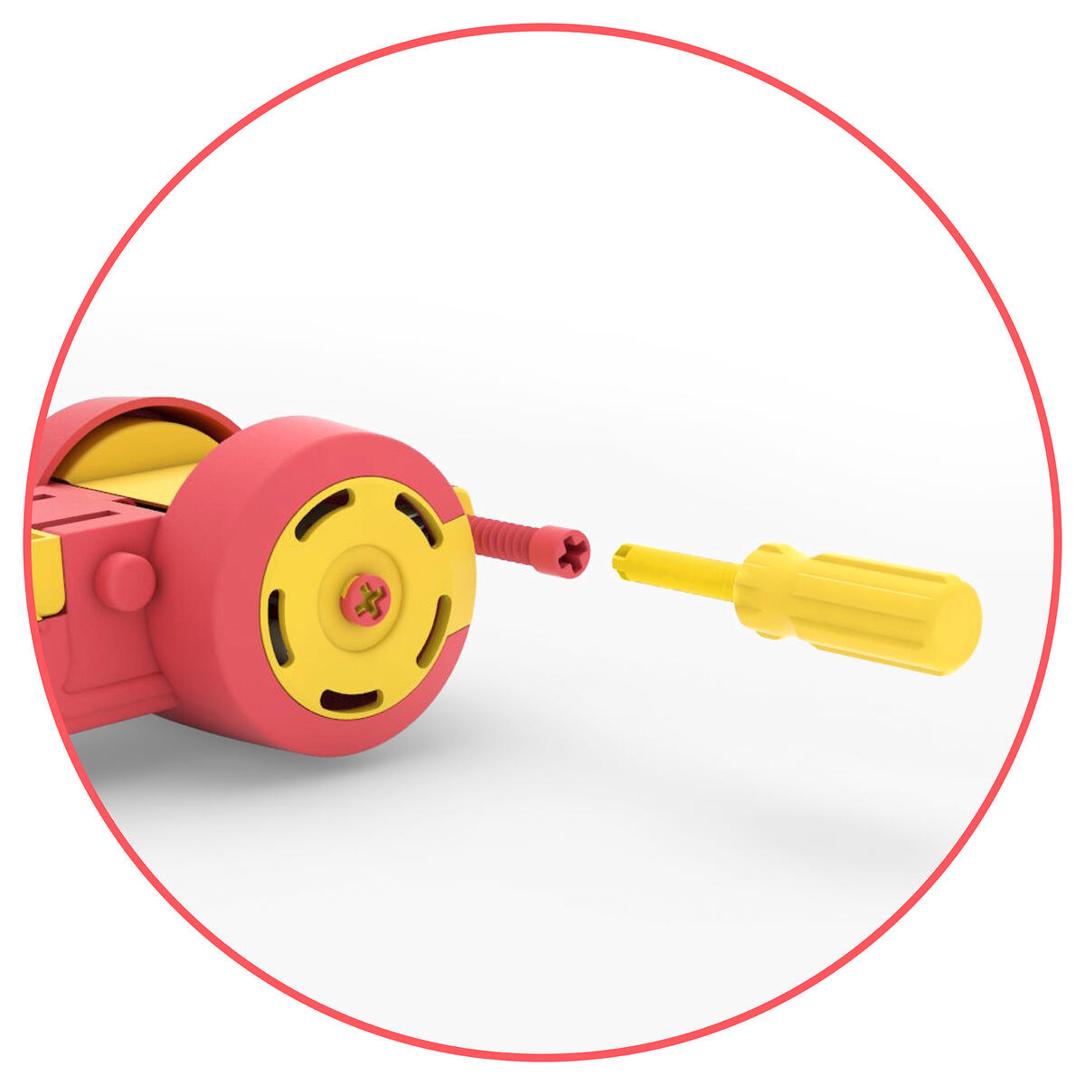 L’enfant peut s’amuser à visser et dévisser des boulons à l’aide d’un petit tournevis directement sur le moteur qui contient également 2 petites zones de stockage à ouvrir et à fermer..