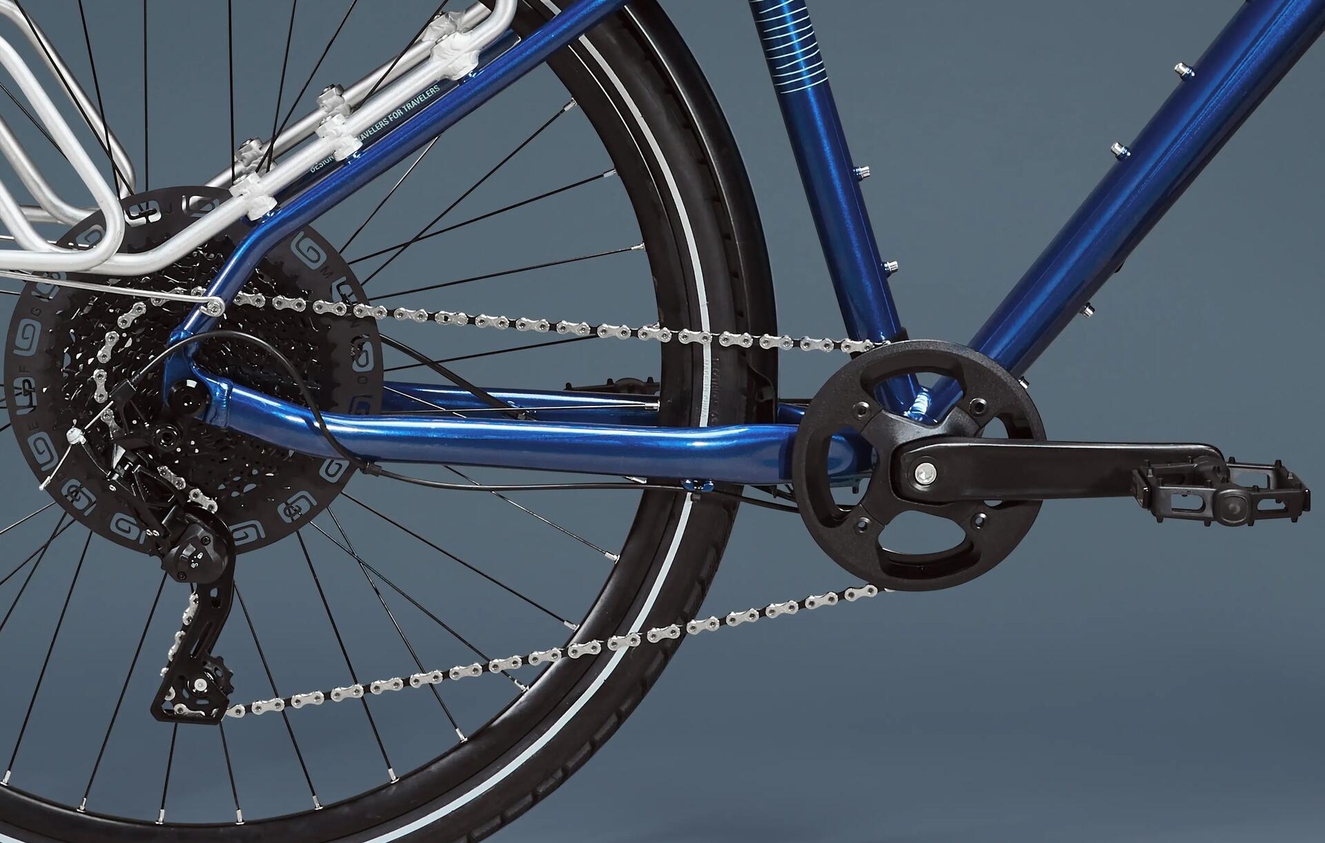 Nous avons choisi des pneus Btwin Trekking 9 Grip Protect+. Des pneus résistants à la crevaison grâce à leur bande anti-crevaison épaisse de 5mm en élastomère. Une accroche aussi efficace sur route que sur chemin, pour être à l’aise sur tous les terrains.
