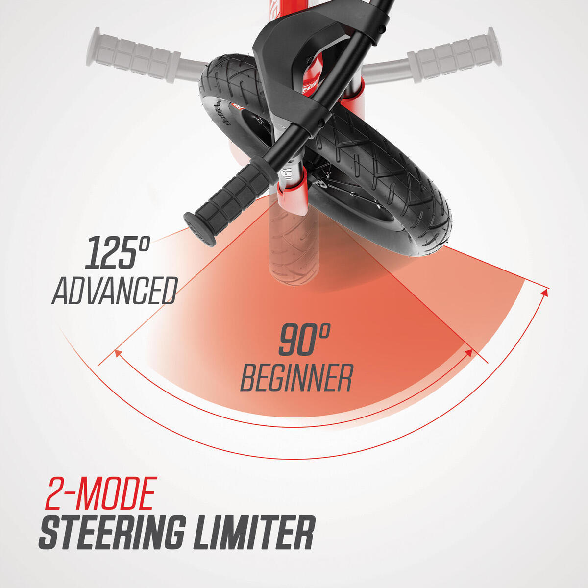 Un vélo d’équilibre est la meilleure préparation pour faire du vélo tout seul. Se tenir en équilibre sur deux roues et (apprendre à) diriger en même temps est tout un défi à un jeune âge. Pour éviter un « pliage » inattendu du guidon, nous avons équipé le BERG Biky d’un limiteur d’angle de braquage qui est réglable avec un mode pour les débutants et un mode avancé.