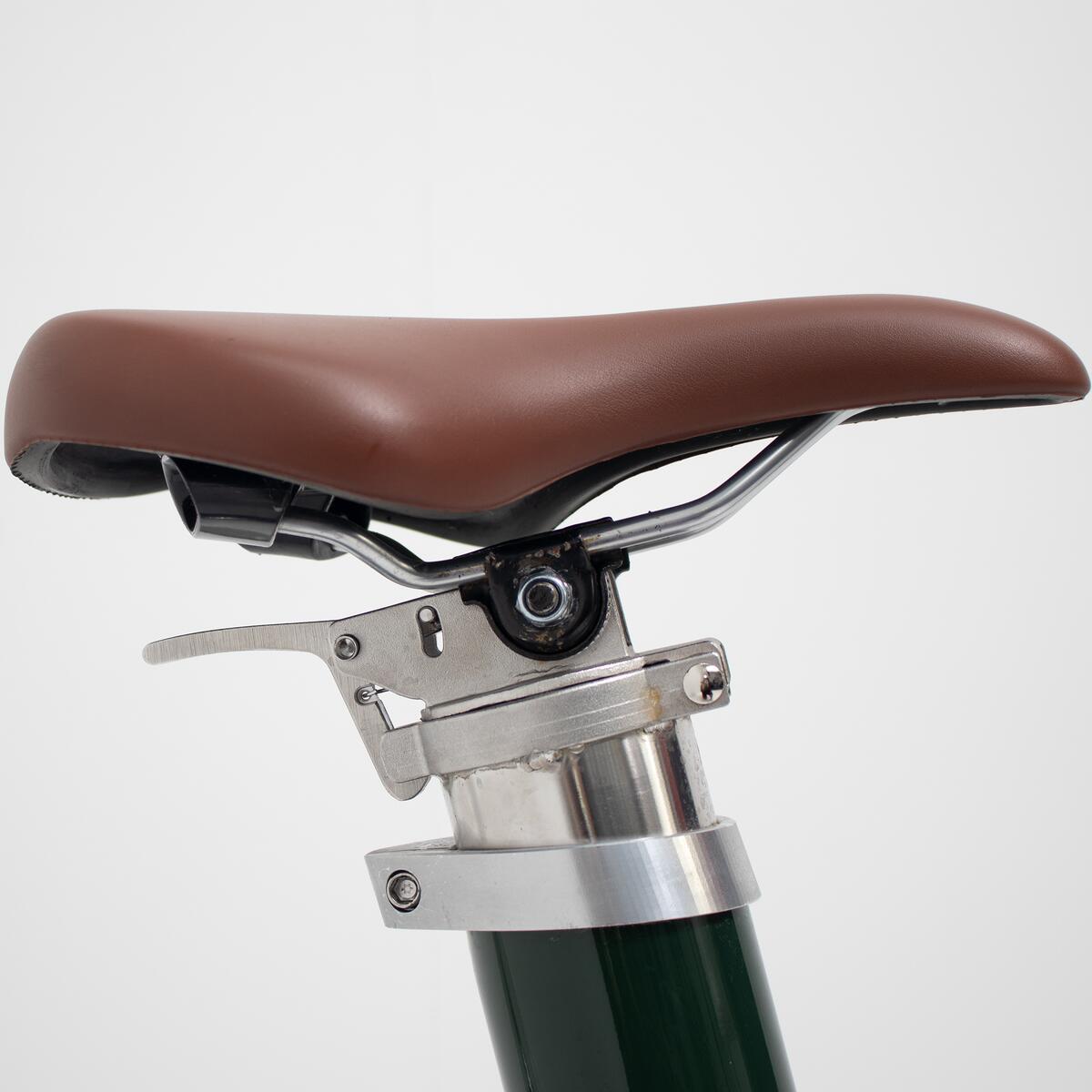 Selle large Cognac en mousse haute densité. Position et inclinaison de la selle réglable grâce au chariot de selle.