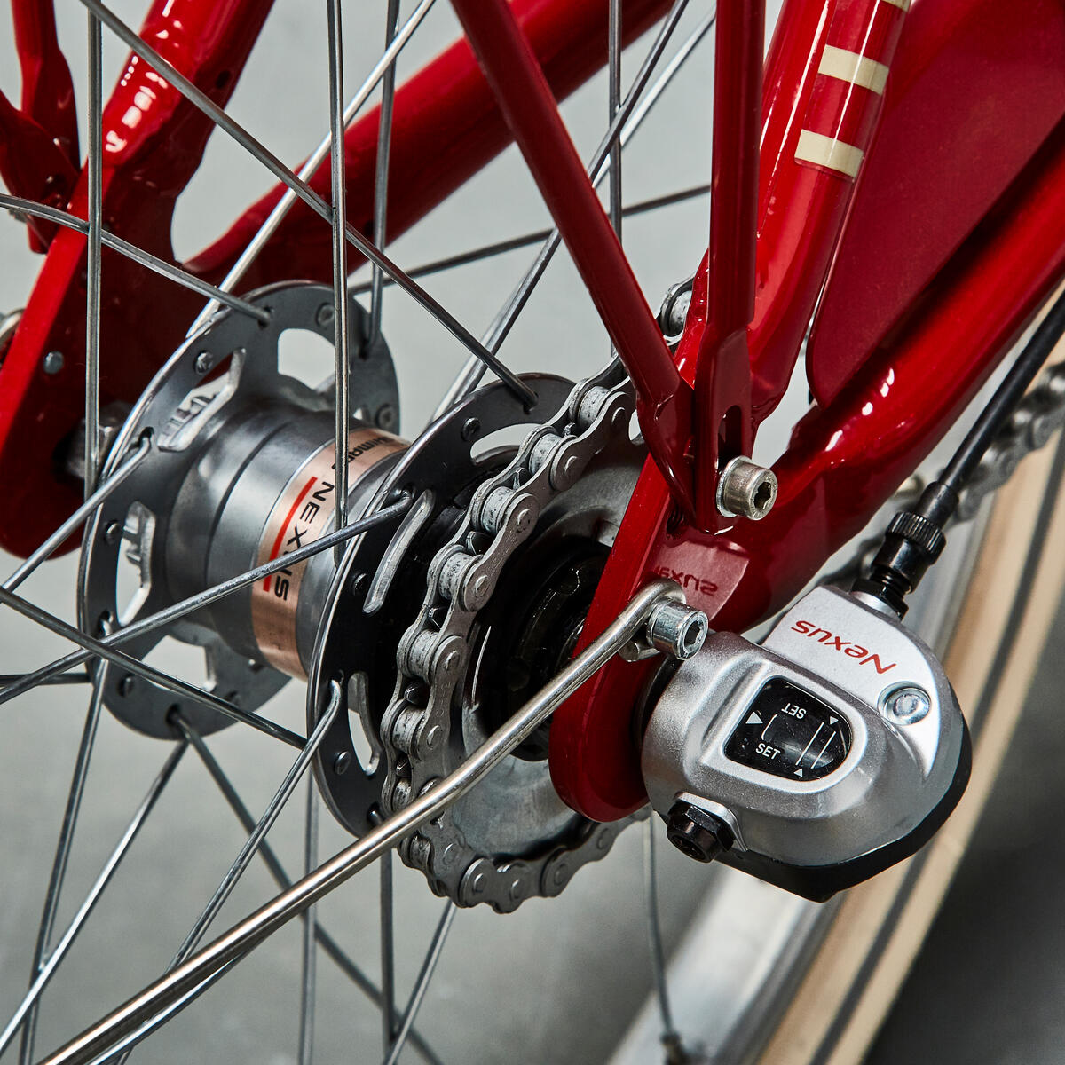 Ce vélo est équipé du moyeu à vitesses intégrées Shimano Nexus 3 vitesses. Il permet des passages de vitesses plus facile, plus de risque de dérailler et les vitesses ne sautent pas. De plus, ce moyeu est plus résistant, il est moins exposé à la pluie, à la poussière et aux chocs : il est idéal pour des déplacements quotidiens en ville. Son entretien est plus simple et comme la chaîne est toujours parallèle, elle s'use donc moins vite !
