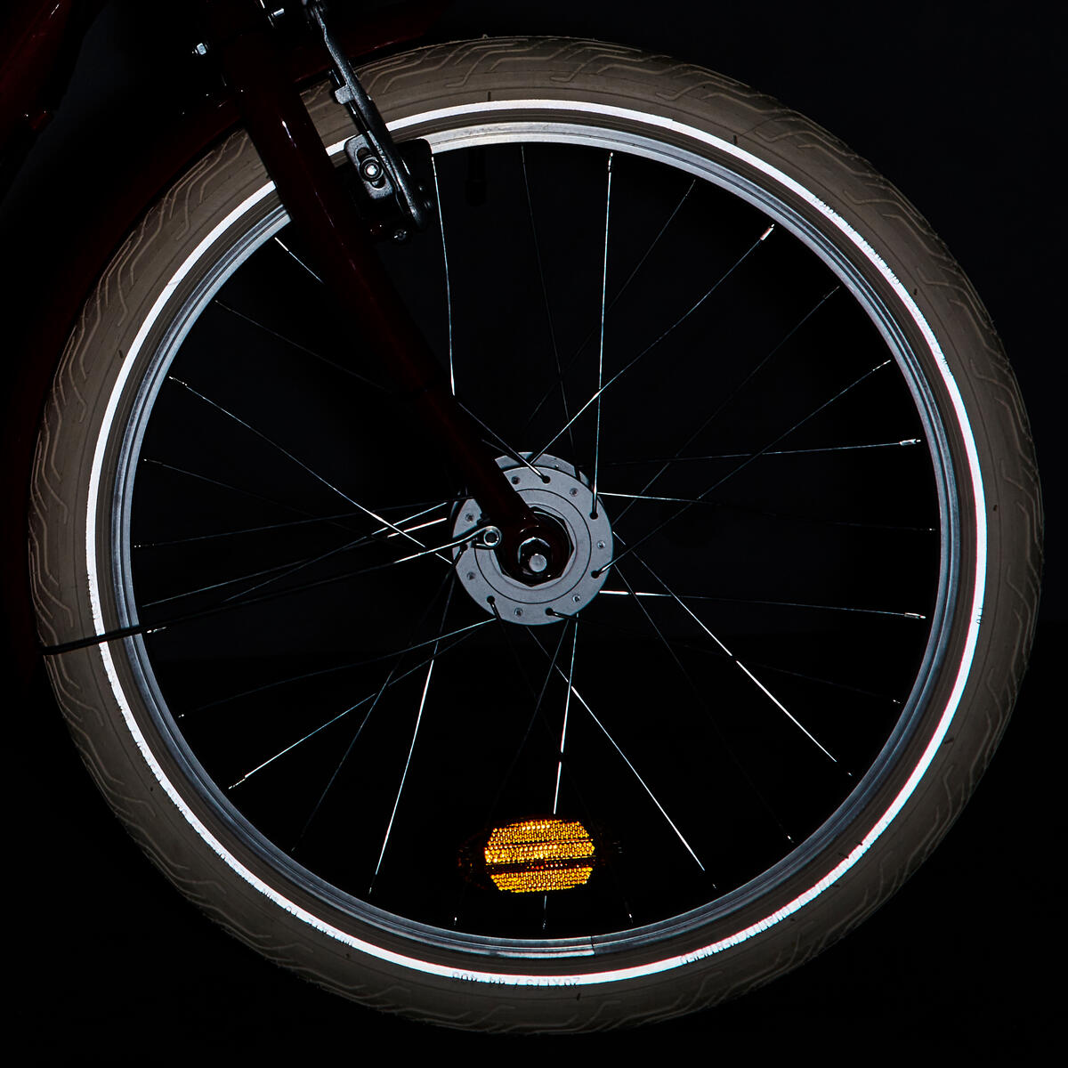 Pour vous déplacer toute l'année, de jour comme de nuit, nous avons équipé ce vélo ville 20 pouces de garde-boue, d'un éclairage LED à dynamo, de pneus à bandes réfléchissantes et d'un porte bagage.